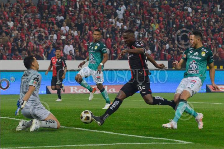 Julián Quiñones, delantero del Atlas trata de marcar ante la cobertura de Rodolfo Cota, portero del León, en la final de la Liga MX Grita Apertura 2021.
