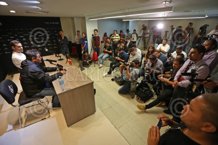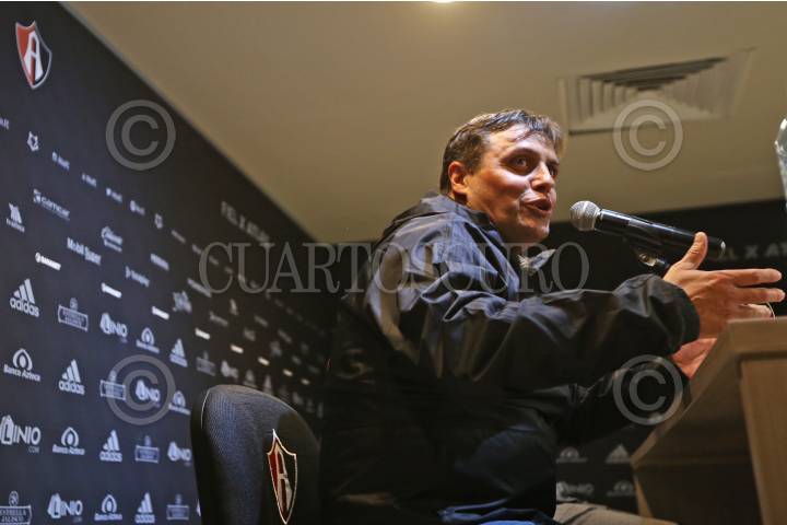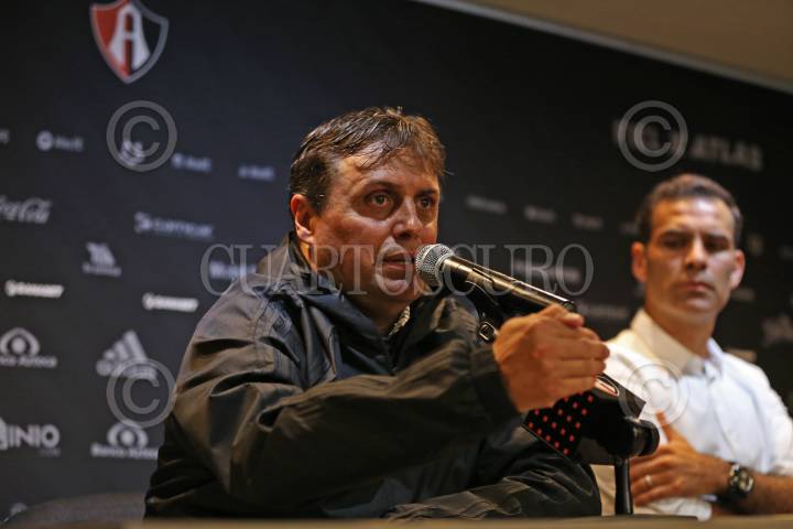 Benjamín Mora, nuevo Director Técnico del Club Atlas de Guadalajara, durante su presentación, esta mañana en la madruguera rojinegra.