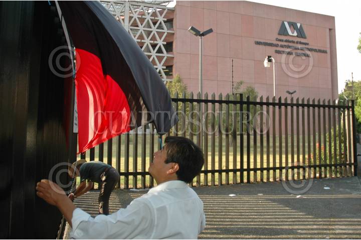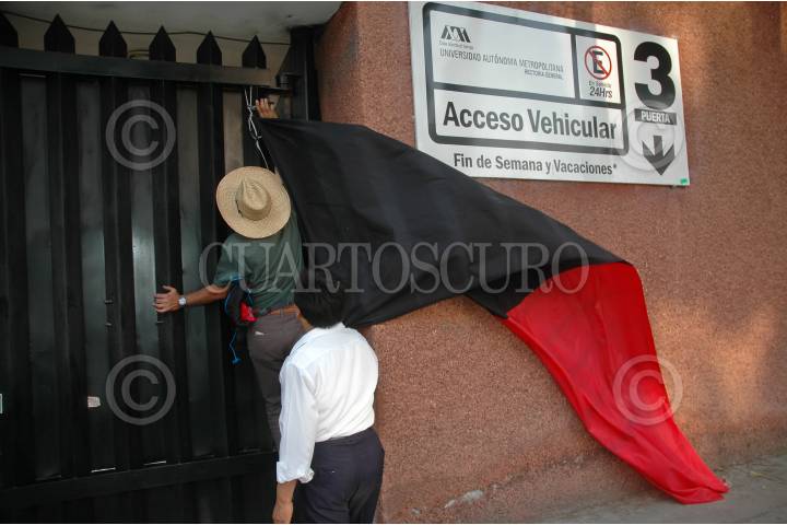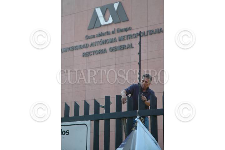 MÉXICO D.F., 05ABRIL2008.- Trabajadores de la Rectoria General de la Universidad Autónoma Metropolitana (UAM) retiran las banderas rojinegras de huelga tras 63 días en paro y después de haber llegado a un acuerdo autoridades de la universidad y autoridades sindicales. FOTO: RODOLFO ANGULO/CUARTOSCURO.COM