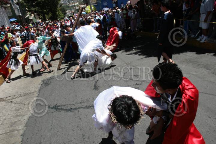 MEXICO, D.F.06ABRIL2007.-En la segunda caida los apostoles tratan de ayudar a Cristo con la carga de su cruz y son retirados por los soldados romanos; esto en la representación del Viacrucis en la colonia Chalma de Guadalupe, delegación Gustavo A. Madero. FOTO JEFTÉ ARGUELLO/CUARTOSCURO.COM