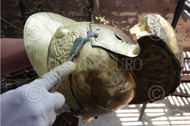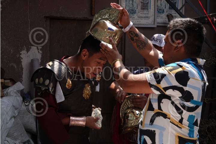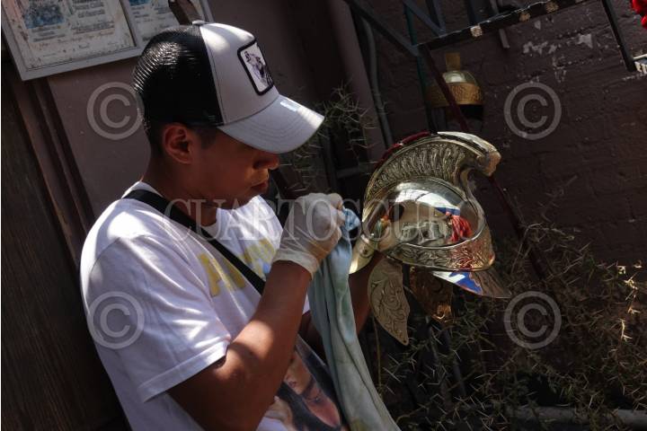 Jovenes que representan a los romanos en la 180 edición de la Semana Santa pulen sus cascos y adornos previos a la celebración de este año