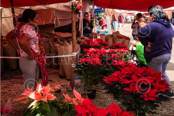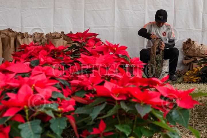 CIUDAD DE MÉXICO, 06DICIEMBRE2024.- Una mujer ofrece sus ejemplares de Nochebuena en las inmediaciones de la Romería de la Central de Abastos (CEDA). Los pasillos de lonas se ubican en la calle Cazuela cerca del cruce entre Eje 5 y Eje 6 Sur día y noche para que las y los habitantes de la capital puedan surtirse en estas fiestas decembrinas. FOTO: GALO CAÑAS/CUARTOSCURO.COM