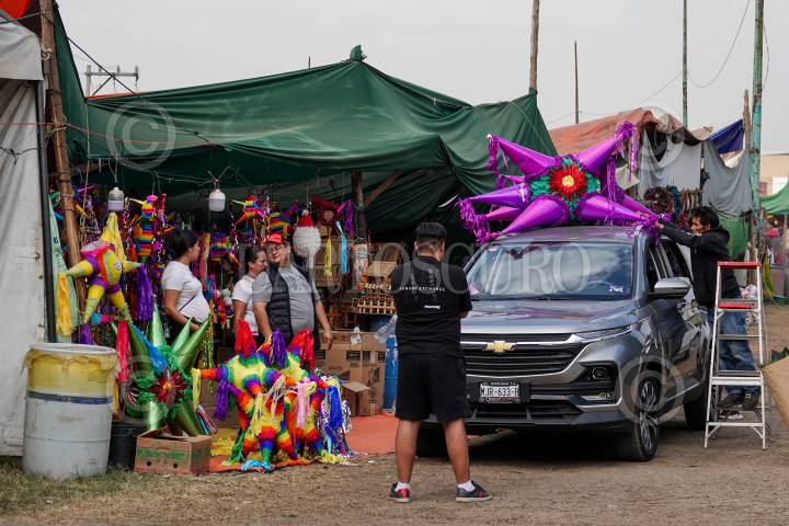 CIUDAD DE MÉXICO, 06DICIEMBRE2024.- Vendedores de piñatas amarran una pieza adquirida en las inmediaciones de la Romería de la Central de Abastos (CEDA). Los pasillos de lonas se ubican en la calle Cazuela cerca del cruce entre Eje 5 y Eje 6 Sur día y noche para que las y los habitantes de la capital puedan surtirse en estas fiestas decembrinas. FOTO: GALO CAÑAS/CUARTOSCURO.COM