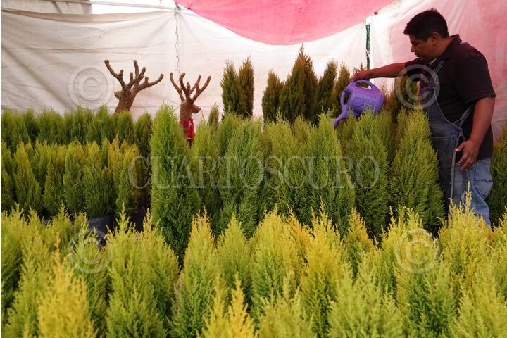CIUDAD DE MÉXICO, 06DICIEMBRE2024.- Un vendedor de pinos riega sus ejemplares en las inmediaciones de la Romería de la Central de Abastos (CEDA). Los pasillos de lonas se ubican en la calle Cazuela cerca del cruce entre Eje 5 y Eje 6 Sur día y noche para que las y los habitantes de la capital puedan surtirse en estas fiestas decembrinas. FOTO: GALO CAÑAS/CUARTOSCURO.COM