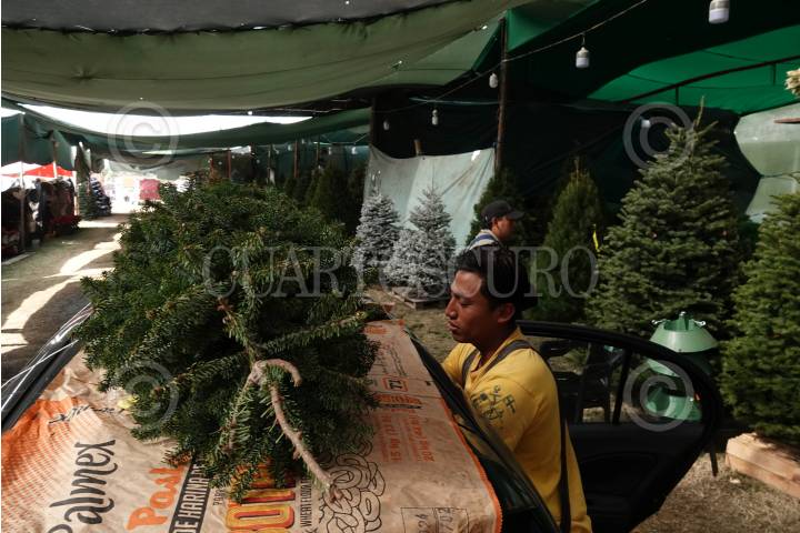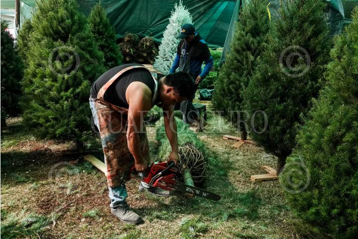 CIUDAD DE MÉXICO, 06DICIEMBRE2024.- Un trabajador corta el excedente de un pino en las inmediaciones de la Romería de la Central de Abastos (CEDA). Los pasillos de lonas se ubican en la calle Cazuela cerca del cruce entre Eje 5 y Eje 6 Sur día y noche para que las y los habitantes de la capital puedan surtirse en estas fiestas decembrinas. FOTO: GALO CAÑAS/CUARTOSCURO.COM