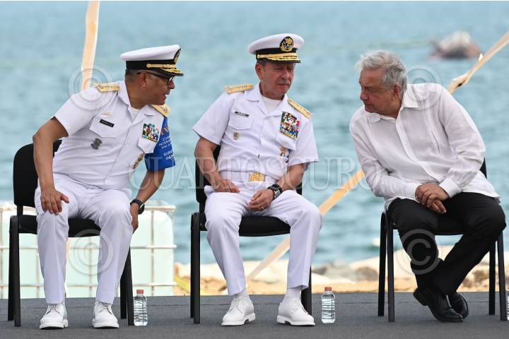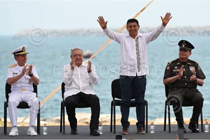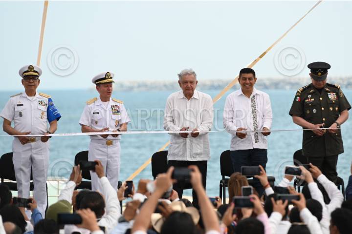 SALINA CRUZ, OAXACA,26FEBRERO2024.- Esta tarde se inauguró el Rompeolas de Salina Cruz,el cual forma parte del proyecto del Corredor Interoceánico, en el puerto continuarán los trabajos para que en un futuro los barcos mercantes embarquen en la zona y atraviesen sus productos atraves del Tren Transísmico. FOTO: DANIEL AUGUSTO/ CUARTOSCURO.COM