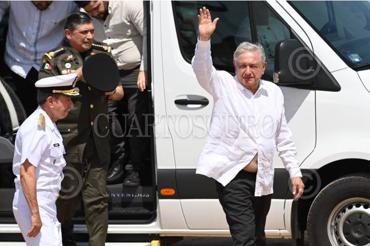 SALINA CRUZ, OAXACA, 26FEBRERO2024.- Andrés Manuel López Obrador, presidente de México, llega a la inauguración del Rompeolas de Salina Cruz, el mandatario estuvo acompañado por el secretario de Marina, Rafael Ojeda y el titular de la Defensa, Luis Cresencio Sandoval. FOTO: DANIEL AUGUSTO/ CUARTOSCURO.COM