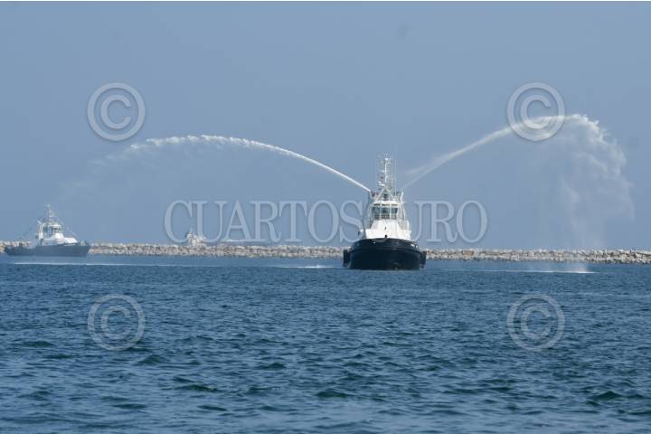 SALINA CRUZ, OAXACA, 26FEBRERO2024.- Un barco de la marina rocía agua por la inauguración del Rompeolas. FOTO: DANIEL AUGUSTO/ CUARTOSCURO.COM