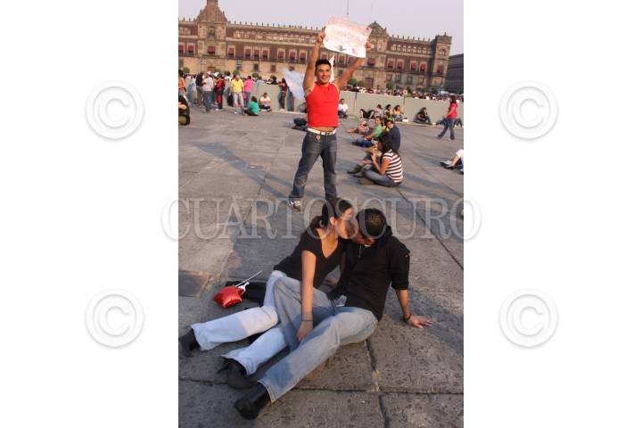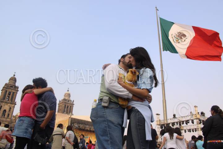 MÉXICO, D.F., 14FEBRERO2009.- La convocatoria para romper el récord Guiness de mayor numero de besos realizada en el zócalo capitalino, no tuvo el èxito que se esperaba, por tal motivo las autoridades capitalinas decidieron cambiar la hora para romper el récord, durante la cual las parejas deberán besarse por 10 segundos para que sea válido el conteo. FOTO:SÁSHENKA GUTIÉRREZ/CUAROTSCURO.COM