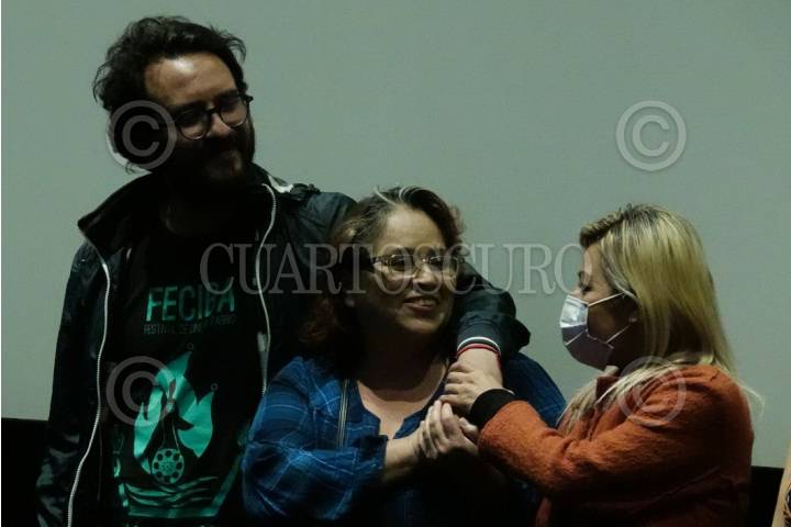 El director Alberto Arnaut, Indira Alfaro, mamá de Yesenia Quiroz y Paty Espinosa, hermana del fotoperiodista Rubén Espinosa, víctimas del múltiple asesinato en la colonia Narvarte, durante la conferencia del documental "A plena Luz", realizado en la Cineteca Nacional
