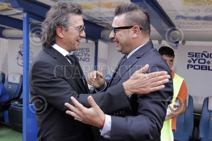 PUEBLA, PUEBLA, 02AGOSTO2014.- Los técnicos del Puebla Rubén Omar Romano y Antonio Mohamed del América, se saludan previo al inicio del partido entre el Puebla de la Franja y las Águilas del América correspondiente a la jornada 3 del torneo de apertura 2014 del fútbol mexicano. FOTO: HILDA RÍOS /CUARTOSCURO.COM