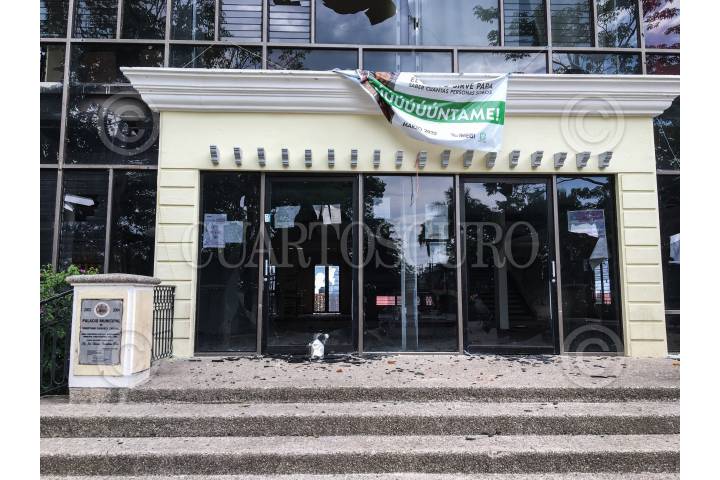 Fachada del Palacio Municipal de Venustiano Carranza después de los destrozos cometidos por al menos 30 personas desconocidas hasta el momento, según datos oficiales.