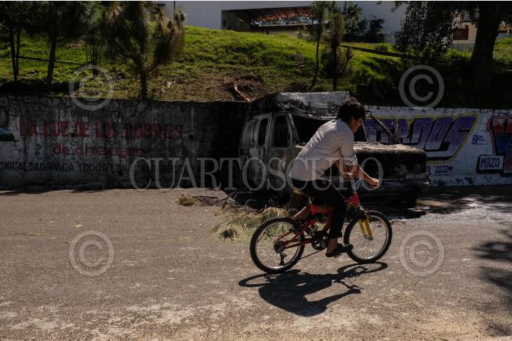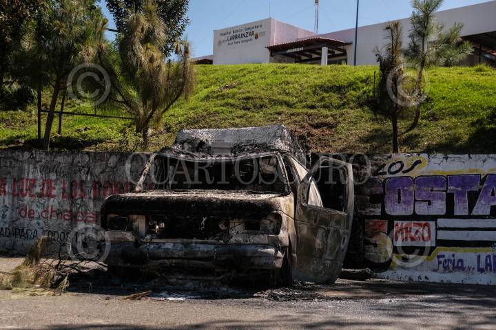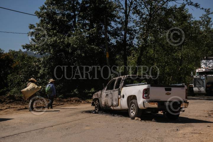 Camioneta propiedad de DIF de San Andrés Larráinzar, bloqueando el paso a la comunidad después de ser quemada la noche anterior por pobladores de la región.