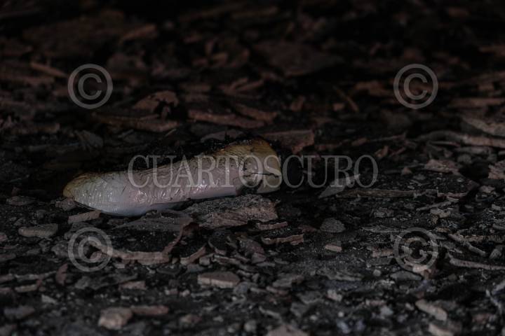 Interior de la bodega supuestamente propiedad de la sindica municipal Elena López López después de ser incendiada por pobladores de la región la noche anterior al oponerse a la fumigación contra el Denge en la comunidad.