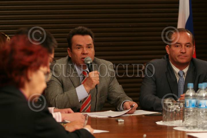 MÉXICO D.F., 25MARZO2009.- Alexander Konakhin, coordinador de proyectos de america latina en la agencia espacial rusa, Sergey Savelev director de la agencia espacial rusa y el senador Fransisco Javier Castellón, presidente de la comisión de Ciencia y Tecnología en el senado, durante una reunión con especialistas de la agencia espacial rusa. FOTO: RICARDO CASTELAN/CUARTOSCURO.COM