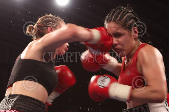 MÉXICO, D.F., 28MARZO2010.- Yazmín "Rusa" Rivas, de calzoncillo negro se enfrento a Zulina "Loba" Muñoz, calzoncillo guinda, por el título mundial gallo juvenil del Consejo Mundial de Box ayer por la noche en el Deportivo de los Trabajadores del Metro. Logrando la victoria la "Loba" por decisión unánime. FOTO: ALBERTO VERA/CUARTOSCURO.COM