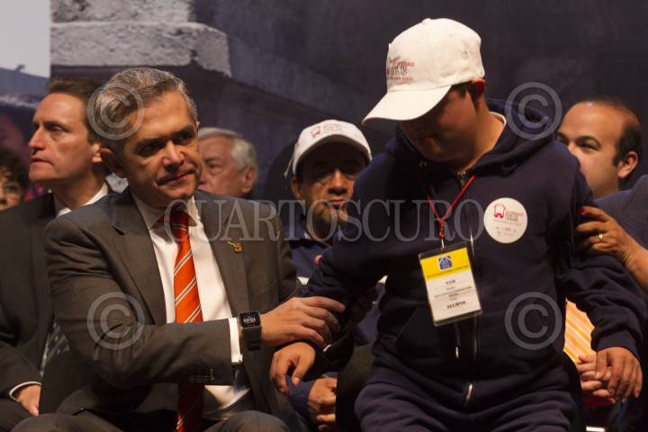 MÉXICO, D.F., 10JUNIO2015.- Miguel Ángel Mancera, Jefe de Gobierno, convive con un pequeño con síndrome de Down durante el arranque del programa de turismo social "Sonrisas por tu Ciudad 2015" en el Teatro Metropolitan. FOTO: MOISÉS PABLO /CUARTOSCURO.COM