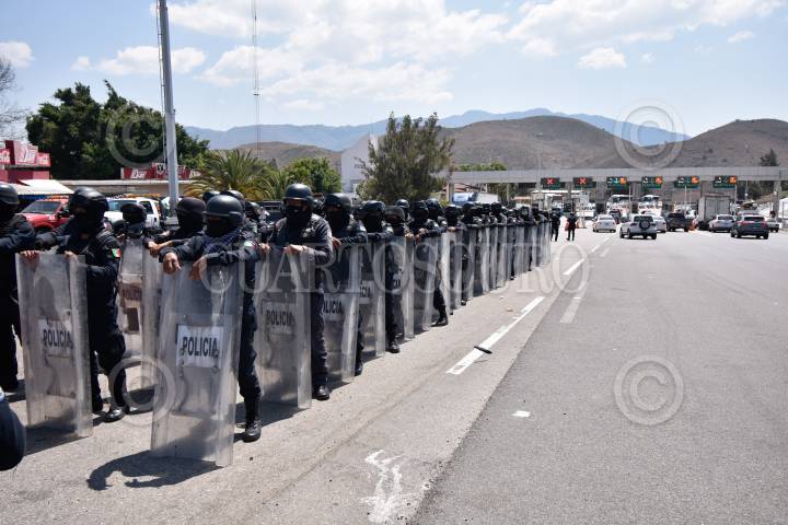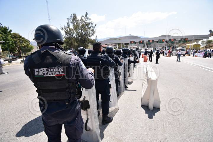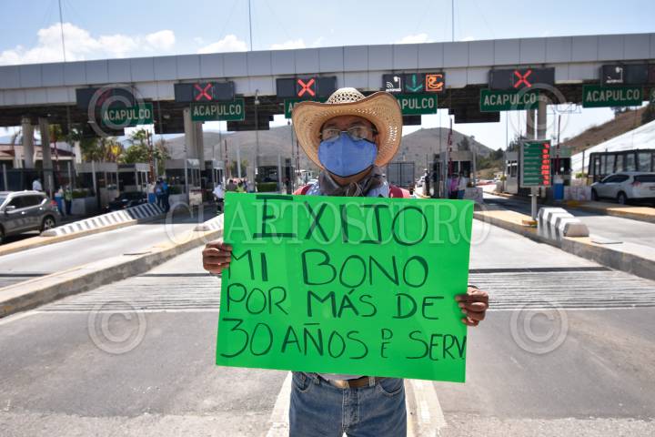 Jubilados de la Secretaria de Educación de Guerrero se manifeston tomando la caseta de Palo Blanco para exigir el pago del estímulo de jubilación para trabajadores educativos.