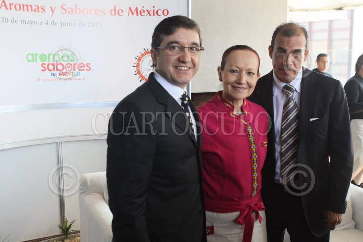 MÉXICO, D.F., 17MAYO2011.- Braulio Cárdenas Cantú, presidente de la CANIRAC, la chef Patricia Quintana, y Gabriel Padilla, funcionario de SAGARPA, al finalizar la presentación de la 3a Ruta Aromas y Sabores de México, que ser inaugurada el próximo 20 de Mayo en la delegación Iztapalapa. FOTO: MOISÉS PABLO/CUARTOSCURO.COM