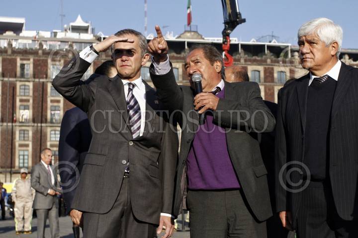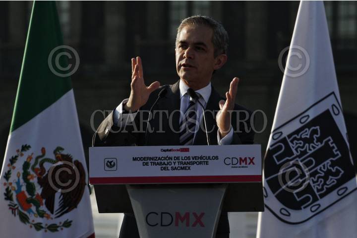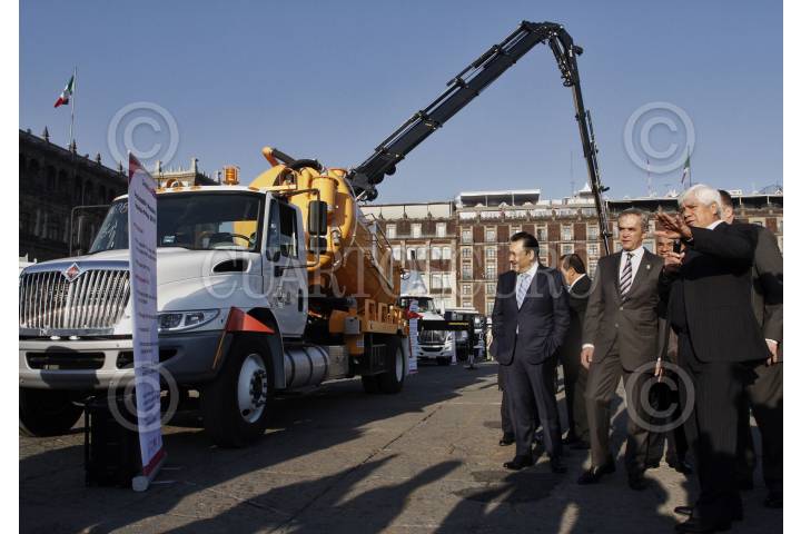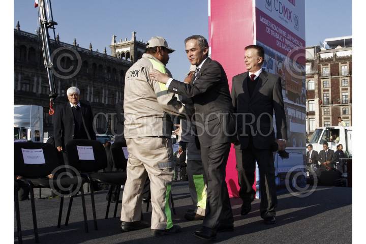 CIUDAD DE MÉXICO, 19FEBRERO2016.- El jefe de Gobierno Miguel Ángel Mancera dio el banderazo de salida a unidades nuevas del Sistema de Aguas de la Ciudad de México, en el zócalo capitalino. FOTO: ISAAC ESQUIVEL /CUARTOSCURO.COM