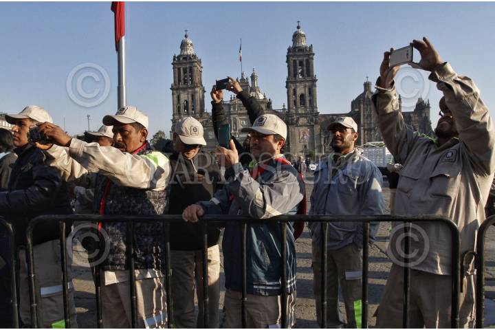 CIUDAD DE MÉXICO, 19FEBRERO2016.- Trabajadores del Sistema de Aguas de la Ciudad de México, toman fotografías del jefe de Gobierno Miguel Ángel Mancera, durante el banderazo de salida a unidades nuevas en el zócalo capitalino. FOTO: ISAAC ESQUIVEL /CUARTOSCURO.COM