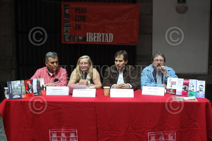 MÉXICO, D.F., 09SEPTIEMBRE2010.-Los integrantes de la Brigada Cultural, Roberto Rico, Paloma Saiz Tejero, Manuel Oropeza y Paco Ignacio Taibo II, ofrecieron un adelanto de la feria del libro alternativa "Para Leer en Libertad", en la que se enfatizó que se evitará la oferta de "libros chatarras" como sucede en la mayoría de ferias de literatura, el encuentro tendrá lugar en la Alameda Central. FOTO: MOISÉS PABLO/CUARTOSCURO.COM