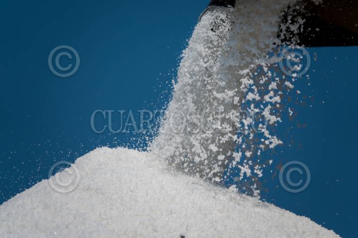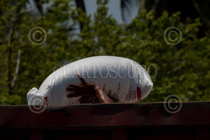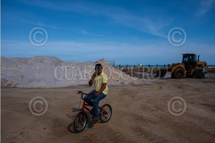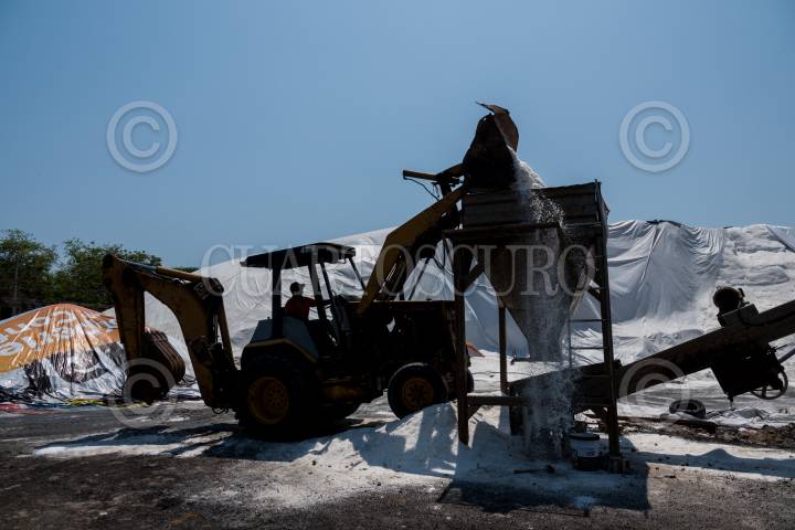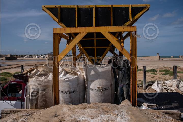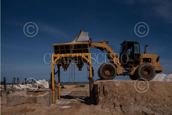 Maquina de llenado de Sal marina en el municipio de Manaure, Colombia.