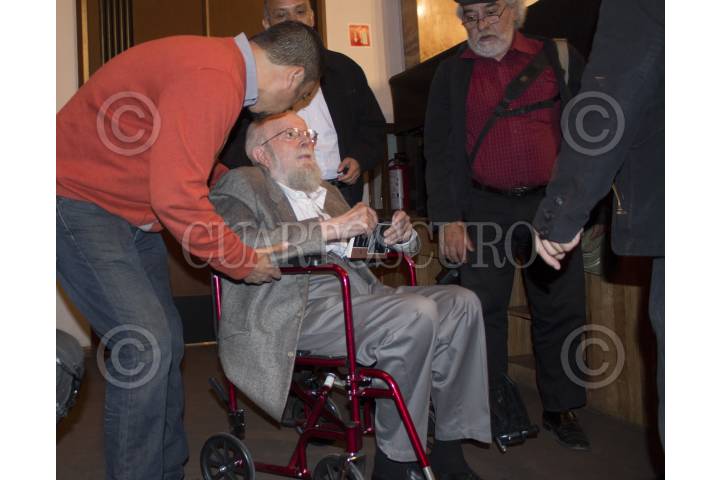 MEXICO, D.F, 18MAYO2014.- En la sala Manuel M. Ponce del Palacio de Bellas Artes se rindió un homenaje al poeta, diplomático, catedrático y crítico Hugo Gutierrez Vega en su cumpleaños número ochenta y dentro del ciclo "Protagonistas de la Literatura Mexicana". En la imagen, el poeta, quien señalò que este año no ha sido bueno para su salud, es ayudado a bajar del escenario. FOTO: DAVID POLO /CUARTOSCURO.COM