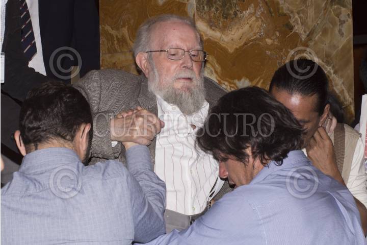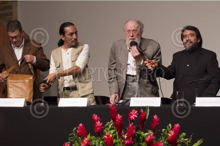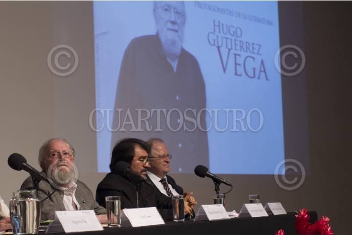 MEXICO, D.F, 18MAYO2014.- En la sala Manuel M. Ponce del Palacio de Bellas Artes se rindió un homenaje al poeta, diplomático, catedrático y crítico Hugo Gutierrez Vega en su cumpleaños número ochenta y dentro del ciclo "Protagonistas de la Literatura Mexicana". En la imagen, el poeta acompañado de Juan Domingo Argüelles, Luis Tovar y Augusto Isla. FOTO: DAVID POLO /CUARTOSCURO.COM