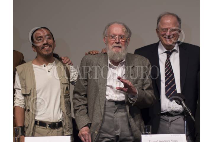 MEXICO, D.F, 18MAYO2014.- En la sala Manuel M. Ponce del Palacio de Bellas Artes se rindió un homenaje al poeta, diplomático, catedrático y crítico Hugo Gutierrez Vega en su cumpleaños número ochenta y dentro del ciclo "Protagonistas de la Literatura Mexicana". En la imagen, el poeta acompañado de Luis Tovar y Marco Antonio Campos. FOTO: DAVID POLO /CUARTOSCURO.COM