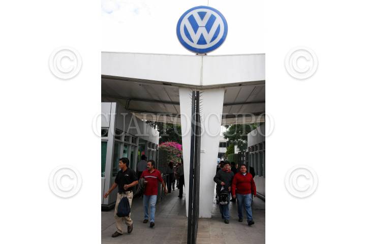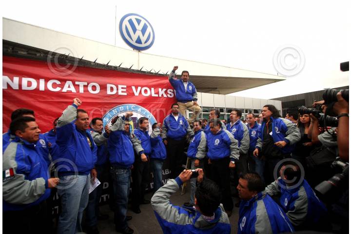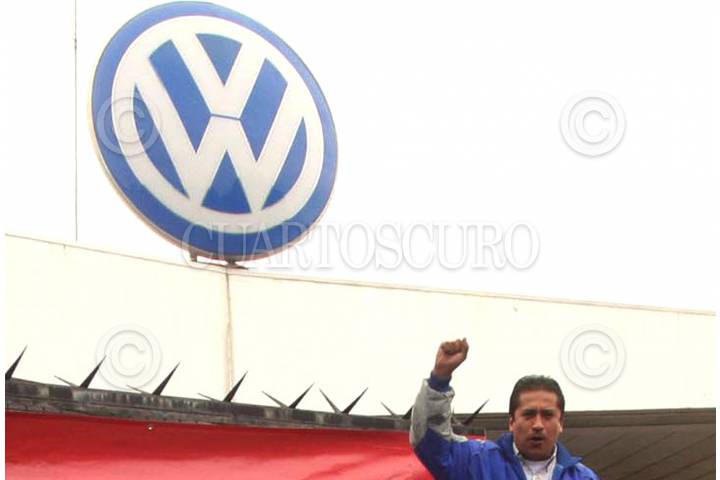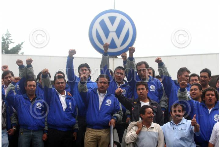 PUEBLA, PUEBLA, 18AGOSTO2009.- Las banderas rojinegras fueron colocadas en Volkswagen de Mexico. Luego de que los trabajadores de la planta instalada en Puebla rechazaron la oferta de la empresa, de un pago único de 5 mil 500 pesos y un aumento salarial del 1 % en febrero del 2010. La planta en Puebla dejará de producir mil 520 automóviles diarios de los modelos Bora, Variant, Jetta y Beetle. El paro fue iniciado por el sindicato, que representa a nueve mil 243 trabajadores, de un total de 12 mil 908 empleados con los que cuenta la planta de Volkswagen en México, al no llegar ambas partes a un acuerdo para la negociación salarial de 2010. FOTO: FRANCO/CUARTOSCURO.COM