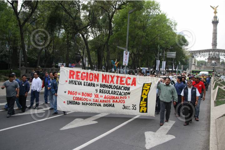 MÉXICO, D.F., 16DICIEMBRE2009.- Integrantes del SNTSA se manifiestan sobre avenida Reforma con dirección al Centro Historico, con pancartas donde exigen el pago de aguinaldos, pago de bono y homologacion salarial. FOTO: MARCO POLO GUZMÁN HERNÁNDEZ/CUARTOSCURO.COM