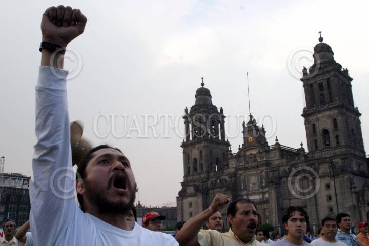 México, D.F. 26 OCTUBRE 2004.- Integrantes de distintos sindicatos universitarios cerraron el mitin entonando el Himno Nacional luego de marchar por Av. Juárez exigiendo aumento salarial. FOTO: Sandra Perdomo/CUARTOSCURO.COM