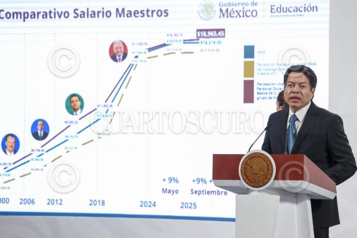 CIUDAD DE MÉXICO, 26MAYO2025.- Martí Batres, director del ISSSTE, señalo que en la época del Presidente Felipe Calderón un maestro promedio se jubilaba con un poco más de 4 mil pesos, mientras que con la Presidenta Claudia Sheinbaum, a través de acciones como la Pensión de Bienestar los profesores se jubilaran con poco más de 16 mil pesos, esto durante la mañanera en la que se tocó el tema de las semanas se la CNTE. FOTO: MOISÉS PABLO/CUARTOSCURO.COM