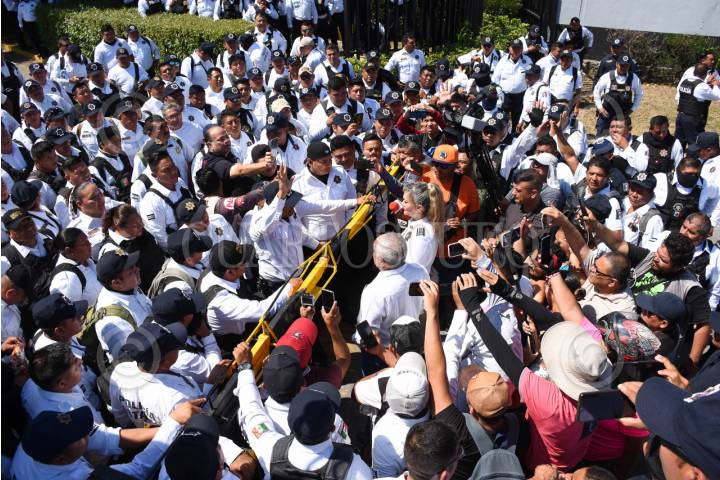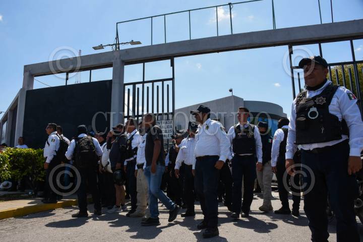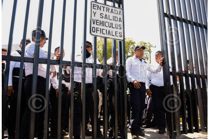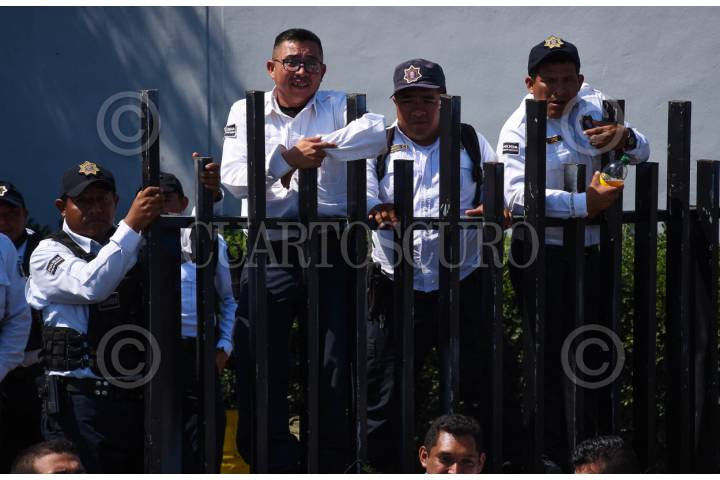 CAMPECHE, CAMPECHE, 16MARZO2024.- Alrededor de más de 600 policías pararon labores en las instalaciones de la Secretaría de Seguridad Publica de Campeche, exigiendo la destitución del director operativo Antonio Saradan Solís. Además, de mejoras a las condiciones laborales y de equipo táctico. Las instalaciones aún están bloqueadas en espera de una respuesta de las autoridades. FOTO: MICHAEL BALAM/CUARTOSCURO.COM