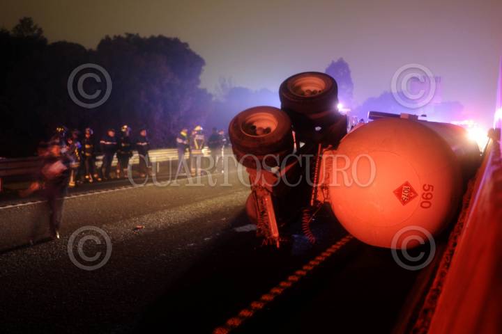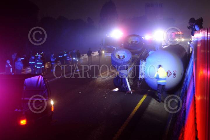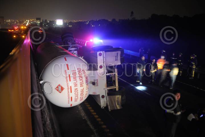MÉXICO D.F. 18JULIO2013.- Una pipa cargada con 45,000 litros de Gas L.P. Volcó esta madrugada en el Km. 20+800 de la autopista México Puebla en la colonia San Lorenzo Tezonco, causando fuerte movilización de servicios de emergencia en la zona y sin que causara algún daño mayor. FOTO: LUIS CARBAYO /CUARTOSCURO.COM