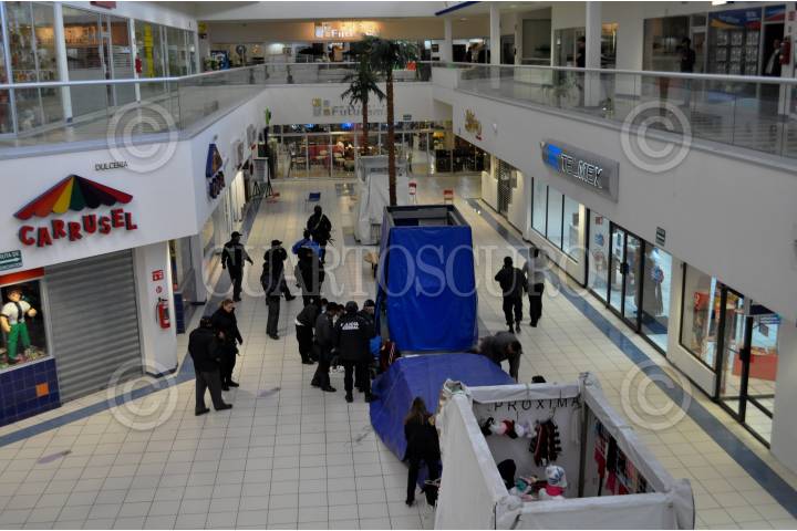 CIUDAD JUAREZ, CHIHUAHUA, 20ENERO2011.- Un enfrentamiento entre asaltantes y policías municipales dejó como saldo un policía municipal asesinado y tres civiles heridos de bala entre ellos dos de los asaltantes; el hecho se registró en el centro comercial Galerías Tec tras asaltar un módulo de pago del predial. Los heridos fueron trasladados a las instalaciones de un nosocomio por Paramédicos de la Cruz Roja Mexicana. Durante el asalto y la posterior balacera, clientes del centro comercial salieron por temor a que una bala perdida les diera alcance y resultar heridos mortalmente. FOTO: NACHO RUIZ/CUARTOSCURO.COM