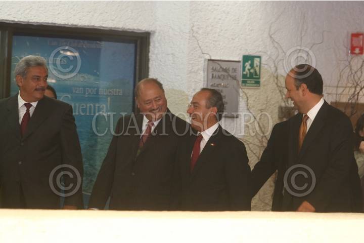 MÉXICO D.F. 10MARZO2008.-El presidente, Felipe Calderón Hinojosa, acudio a la comida de Clausura de los trabajos de la LXXI Asamblea General Ordinaria de la Cámara Nacional de la Industria Textil.En la imagen es acompañado por Enrique Peña Nieto, Gobernador del Estado de México, Rafael Zaga Calach presidente saliente de la cámara, Davida García Cosio presiednte entrante de la cámara y Eduardo Sojo, titular de la Secretaría de Economia. FOTO: GUILLERMO PEREA/CUARTOSCURO.COM