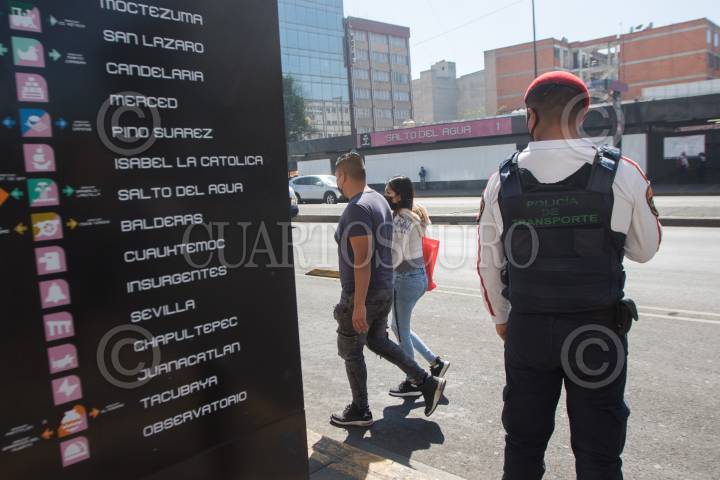 Policías del transporte, vigilan el servicio de microbuses quienes se encuentran brindando servicio en la linea 1 del metro