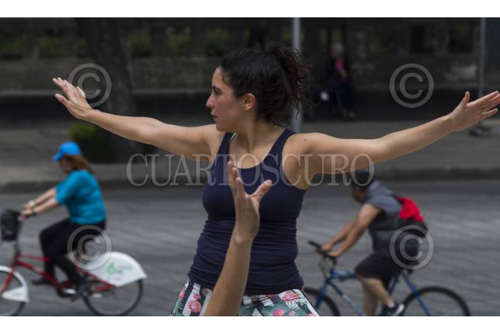 CIUDAD DE MÉXICO, 11SEPTIEMBRE2016.- Ejercicios de estiramiento durante el Paseo Ciclista, que cada domingo se celebra en avenida Reforma y otras de vialidades. Aunque en un principio la invitación solo era para pasear en dos ruedas, hoy decenas de ciudadanos lo utilizan para practicar un sin fin de actividades físicas. FOTO: MOISÉS PABLO /CUARTOSCURO.COM