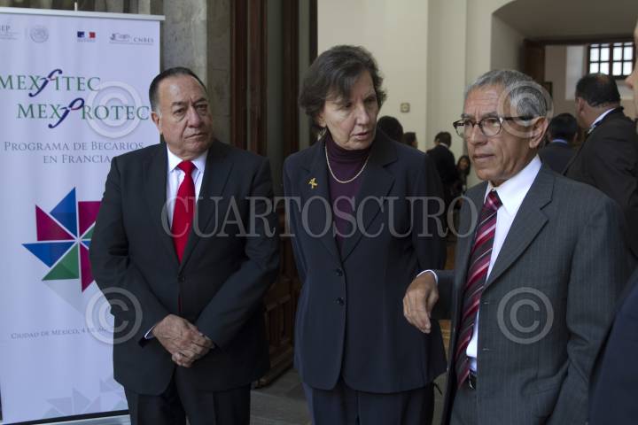 CIUDAD DE MÉXICO, 04AGOSTO2016.- José Ernesto Maedina Aguilar, coordinador nacional de becas de Educación Superior; Marysse Bossiere, embajadora de Francia, y Salvador Jara Guerrero, subsecretario de Educación Superior, durante la ceremonia de despedida de becarios MEXFITEC y MEXPROTEC 2016-2017, en el salón Hispanoamericano de la Secretaría de Educación Pública. FOTO: MOISÉS PABLO /CUARTOSCURO.COM
