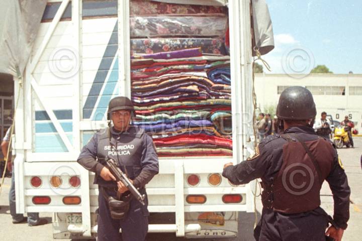 MEXICO, D.F. 30JUNIO2005.- Elementos de la Secretaria de Seguridad Publica, detuvieron una camioneta de 3/12 toneladas que aparentemente transportaba colchones, detras del mismos se encontraban 21 ilegales que procedian de Guatemala y El Salvador, con ellos dos integrantes de "La Mara Salvatrucha". FOTO: Oscar López/CUARTOSCURO.COM