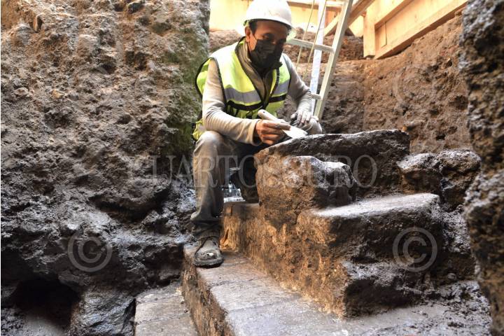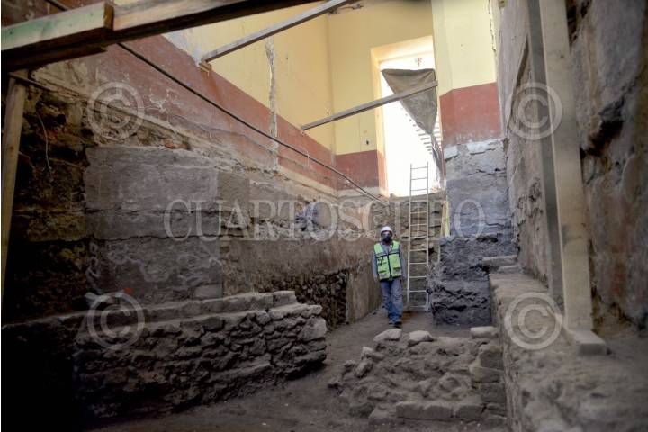 CIUDAD DE MÉXICO, 25OCTUBRE2023.- En el subsuelo del Centro Histórico de la Ciudad de México, dentro de la antigua Escuela de Jurisprudencia, personal del Instituto Nacional de Antropología e Historia (INAH) no solo ha recuperado una notable escultura con forma de cabeza serpiente, dada a conocer en días recientes, sino también importantes vestigios prehispánicos y virreinales que narran el devenir de la capital del país. El proyecto de salvamento arqueológico que la Secretaría de Cultura del Gobierno de México realizó, a través del INAH, en el inmueble de la Universidad Nacional Autónoma de México (UNAM), reveló la existencia de una edificación mexica, la cual se calcula medía 13.50 metros de ancho por 23.20 de largo. FOTO: INAH/CUARTOSCURO.COM