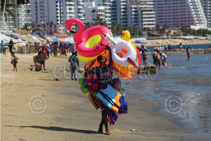 Un vendedor ofrece salvavidas en la playa de Acapulco