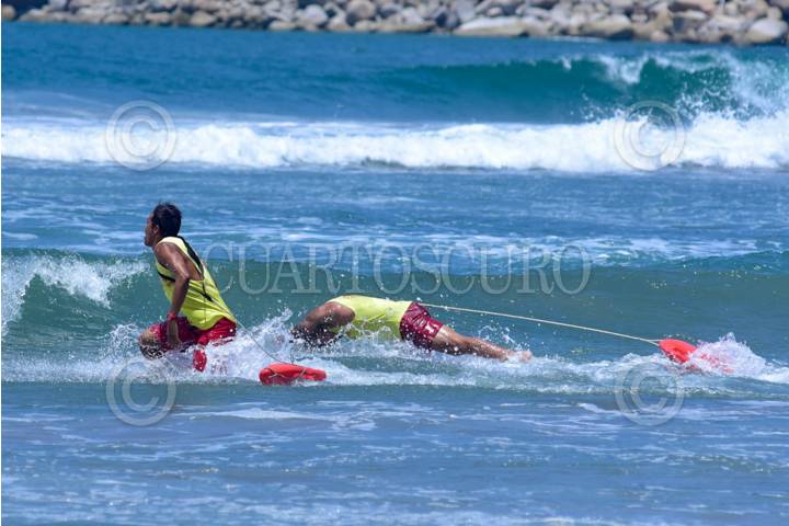 ACAPULCO, GUERRERO, 08AGOSTO2024.- Salvavidas de la Promotora de Playas de Acapulco y Protección Civil de Guerrero, realizaron un simulacro de rescate acuático de turistas en la playa Revolcadero, como parte del Operativo Vacacional Verano 2024 que busca reforzar las medidas de seguridad en playas. FOTO: CARLOS ALBERTO CARBAJAL/CUARTOSCURO.COM