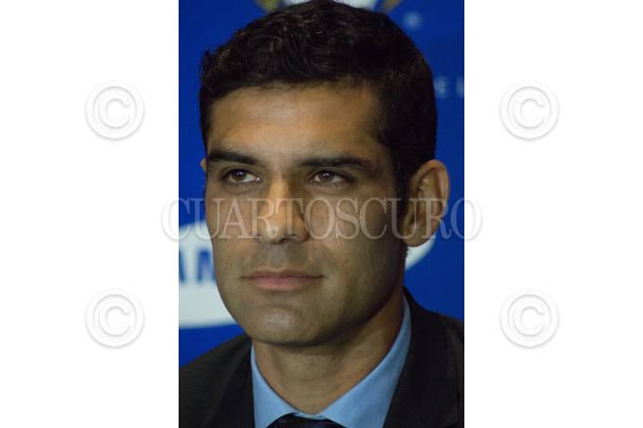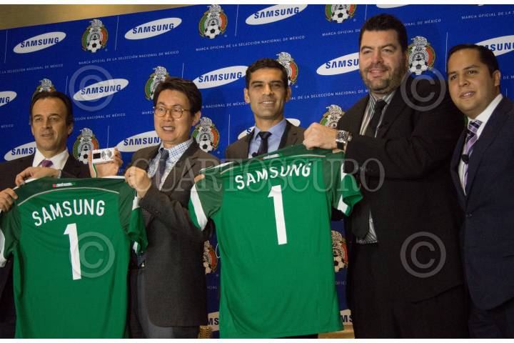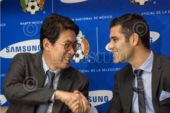 MÉXICO, DF., 24MARZO2014.- Rafael Márquez, capitán de la Selección Mexicana, acudió a la presentación de la nueva campaña de la marca coreana de tecnología Samsung, "Únete al juego", en el marco del próximo mundial de fútbol en Brasil. Acompañado de Héctor Yung, director de Samsung Mèxico y de Fernando Cedillo, presidente de Femexfut, recibió la nueva cámara de Samsung. FOTO: MARÍA JOSÉ MARTÍNEZ /CUARTOSCURO.COM