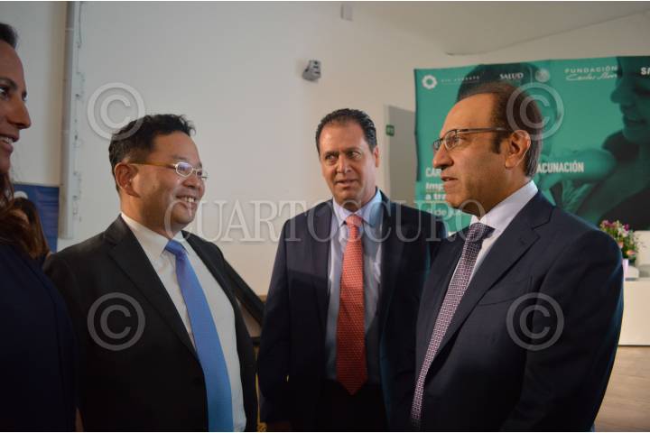 CIUDAD DE MÉXICO, 08JUNIO2017.- H.S. Jo, presidente de Samsung Electronics México, Pablo Kuri, subsecretario de Salud y Marco Slim Domit durante el evento de la donación simbólica de mil tabletas cuya característca es un lector NFC, que permitirá al personal de vacunación escanear un código adherido a las Cartillas Nacionales de Salud para generar un respaldo digital de la información de vacunación de los derechohabientes. Se espera que para finales del año más de dos millones de niños menores de 5 años cuenten con la Cartilla Electrónica de Vacunación a nivel nacional. FOTO: SELENE PACHECO /CUARTOSCURO.COM