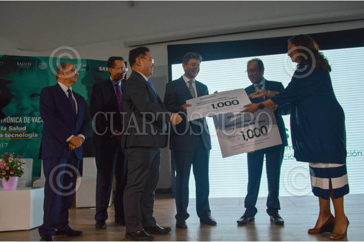 CIUDAD DE MÉXICO, 08JUNIO2017.- Claudia Conteras, directora de marketing de de Samsung Electronics México, H.S. Jo, presidente de Samsung Electronics México, y Marco Slim Domit donaron de manera simbólica a Pablo Kuri, subsecretario de Salud, mil tabletas cuya característca es un lector NFC, que permitirá al personal de vacunación escanear un código adherido a las Cartillas Nacionales de Salud para generar un respaldo digital de la información de vacunación de los derechohabientes. Se espera que para finales del año más de dos millones de niños menores de 5 años cuenten con la Cartilla Electrónica de Vacunación a nivel nacional. FOTO: SELENE PACHECO /CUARTOSCURO.COM