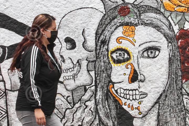 Ciudadanos caminan entre murales alusivos a la muerte en una de las colonias más infectadas por COVID-19.