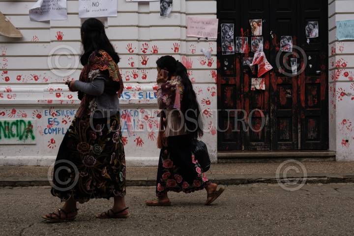 Dos mujeres originarias del Municipio de Zinacantan pasan frente a la fachada de la Facultad de Derechos de la UNACH intervenida por activistas feministas después del asesinato de Mariana Sánchez estudiantes de medicina.